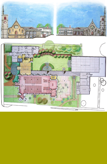 A new stone masonry and glass structure connects the early nineteenth century stone gothic church to the adjacent entry for the church. The connector will contain a large reception space and garth beyond. This new garth, behind the connector is the centerpiece to the project, providing an outdoor area for the church's numerous functions and receptions and is the focus of the views from inside the reception space. A random patterned bluestone terrace at the connector's front entrance is designed to be a gathering space for parishioners after services. The open lawn garth is framed by the church facade on one side, opposed by retaining walls enclosed by a row of ornamental trees and the existing function hall beyond. Within the garth, a semi-circle paved terrace, three feet below the lawn grades, allows parishioners to gather around a small fountain that serves as the focal point for the garth. Opposite to and on axis with the fountain is a curved vine covered pergola that will provide shaded seating as it focuses out to the open space of the garth. |