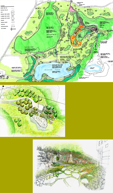 A 250 acre farm in Kent, CT is the site of the new weekend and future retirement home for a Manhattan couple. The house is sited on the wooded upper elevations with commanding views across a lake, and beyond to the distant hills. View corridors through existing pastures and cleared openings, are framed by sculpted wooded edges. The effect is a site that reflects the principles of the 18th century English Landscape School. DBLA incorporated these historic design principals into a master plan responsive to contemporary life-style requirements. A serpentine drive winds down the slope providing a variety of visual experiences. At the entry point the drive overlooks an open pasture with views down to the lake as it curves around an old apple orchard and along side classic New England farmers’ walls. A vehicular arrival area within a newly created apple grove, terminates the drive. Large fieldstone slabs lead through a covered passage to an entry courtyard. The courtyard, sculpted by descending boulder terraces and overlooks contains lush colorful plantings. |