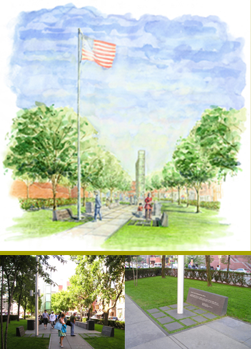 The Friend’s of The New England Holocaust Memorial, dedicated a monument honoring the WW II American Soldiers who were among the first of the Allied forces to enter the Nazi concentration camps, liberating the imprisoned Jews. David Berarducci Landscape Architecture (DBLA) developed the design plans for the monument from a conceptual design by architects Finegold Alexander + Associates, Boston. The monument, located along Boston’s Freedom Trail and adjacent to the existing Memorial site, consists of two black granite slab grids, with open grass joints. The grid arrangements flank each side of the central walkway, each with a raised granite tablet at opposite ends matching details of the Memorial itself. One side features a 40 foot high lighted flagpole displaying the American Flag, the other an inscribed quote from then General, Dwight D. Eisenhower. In addition to the Liberators’ Monument, DBLA addressed a series of functional problems within the site and developed a series of recommended improvements addressing these problems. |