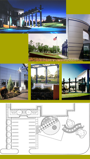 The bold forms of the design, respond to the building’s architectural forms. while providing a snow drift buffer for the front of the building. The design consists of a water feature between the walkway and building, with five curving jets emerging from a bed of black river stones; two curvilinear hedge bands of purple leafed Berberis punctuated with columnar Junipers weave through two mounded, ground covered islands containing fastigiate Ginkgo trees. A half circle tilted plane, 4 feet at the highest point, slopes toward the new canopied walkway, providing a sense of enclosure for this new main entrance approach. The tilted plane is supported by a curved, 27’ radius wall of 1/2” cor-ten steel and sits on an askew ‘carpet‘ of groundcover. Cor-ten steel is also used as sculptural edging for the river stone water feature and the 12 foot diameter flower bed circle within the tilted plane. |