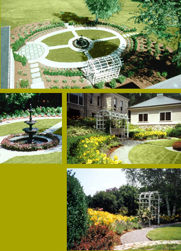 A new formal ellipse garden was created on an existing plateaued area along the sloping hillside. The garden is accessed from the main house by a series of bluestone stairs and landings leading down to a round bluestone terrace with open sod joints, located at the head of the ellipse. The ellipse, with its axial symmetry, is in the traditional Italian Garden style, responding to the classical styling of the mid-19th century, brick and granite mansion. Stone dust paths define the ellipse’s perimeter and form the cross axis, framing four lawn panels. A three tiered, cast iron fountain is the focal point of the ellipse. At one end of the cross axis is a lattice enclosed rose arbor containing a bench which focuses on the fountain and across to a stairway, that leads to the lower lawn. The plantings, arranged radially around the ellipse, reinforce it’s form with colorfully textured bands of evergreen hedges, flowering shrubs, roses and perennials. The plantings provide structure for the garden, as well as color and fragrance, throughout the seasons. |